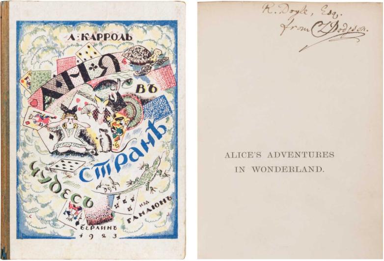 Left: The “original Alice’s” own copy of Vladimir Nabokov's Russian translation of Alice that is considered almost as rare as the 1865 suppressed first edition of Alice, $10,000/15,000. Right: First authorized edition of Alice, inscribed by Carroll to the British illustrator Richard Doyle, $30,000/50,000.