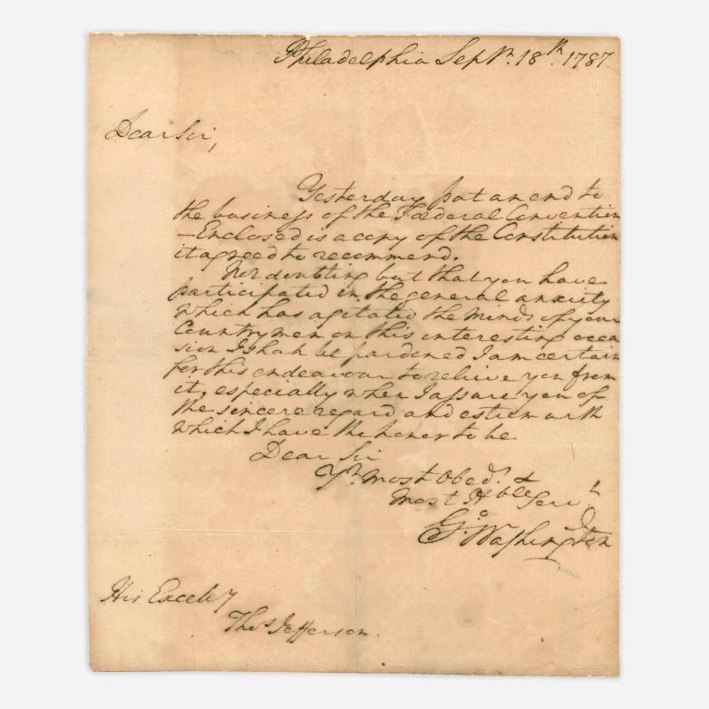 Philadelphia - The day after the completion and signing of the Constitution of the United States of America in September 1787, George Washington sent a copy of the landmark document to Thomas Jefferson, along with a personal letter announcing its adoption. In Freeman’s November 15 Books and Manuscripts: Rare Americana auction, that letter will be offered with an estimate of$1,000,000-1,500,000 (Lot 14).