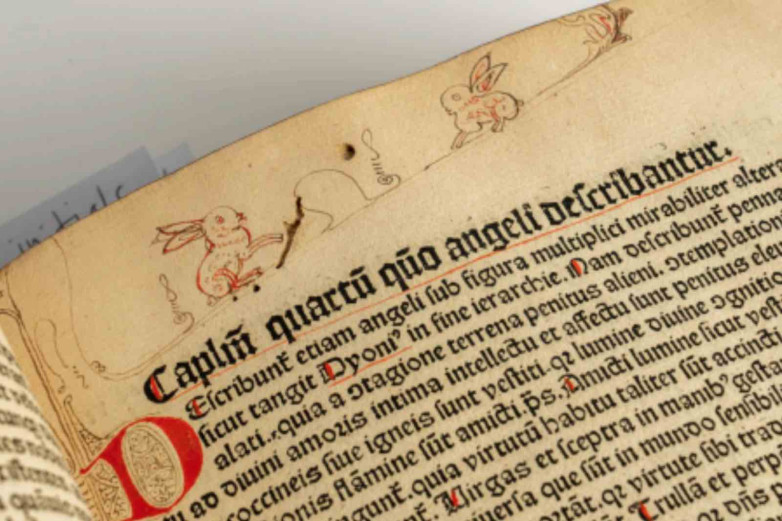 "Bartholomaeus’s De proprietatibus rerum includes some delightful drawings of hares, oak leaves and acorns," said Nicholas Worskett, book and manuscript specialist at Bellmans, "the kind of seemingly arbitrary scribe's 'doodles' sometimes found in the margins of medieval, but it’s the drawings of hares which add a great deal of charm to this copy."