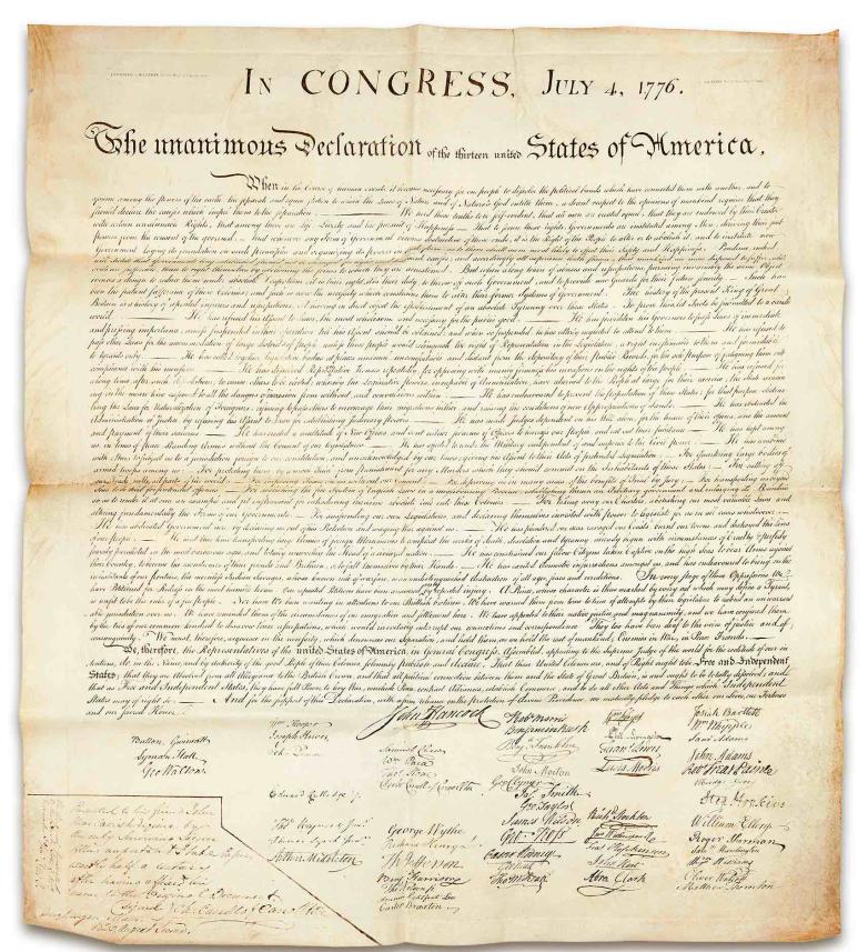 According to Seth Kaller’s current census of the Stone facsimiles, of the original 201 copies printed, approximately 52 survive. Says Darren Winston, head of Freeman’s Books and Manuscripts department, “I marvel that this amazing document probably left America in the mid-19th century on a sailing ship bound for the British Isles, then likely continued by horse-drawn coach or rail—or both—to Scotland, and the whole journey probably took six weeks. 177-odd years later, it was rediscovered and shipped back across the Atlantic, this time by automobile and airplane, and it took two days. That’s not just a long time between trips; that’s practically the entire history of transportation! Now, not only has it returned ‘home,’ but it is about to be offered for sale in the same city where its original owner put quill to paper on August 2, 1776, and signed his name in support of American independence.”
