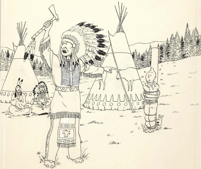 Tintin in America was the third in the Tintin series, first published in 1932 with a cover illustration depicting Tintin sitting on a rock with Snowy next to him. For the third edition in 1937, this was replaced with one of Tintin riding a horse. The drawing now on sale is the original for the cover of the 1942 edition, then reused for the 1946 first colour edition and in use ever since.