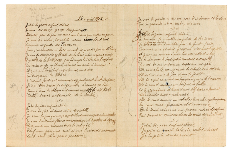 Guillaume Apollinaire. POÈME AUTOGRAPHE À LOUISE DE COLIGNY-CHÂTILLON (LOU), SIGNÉ GUI, DATÉ 28 AVRIL 1915. Estimate €20,000-25,000