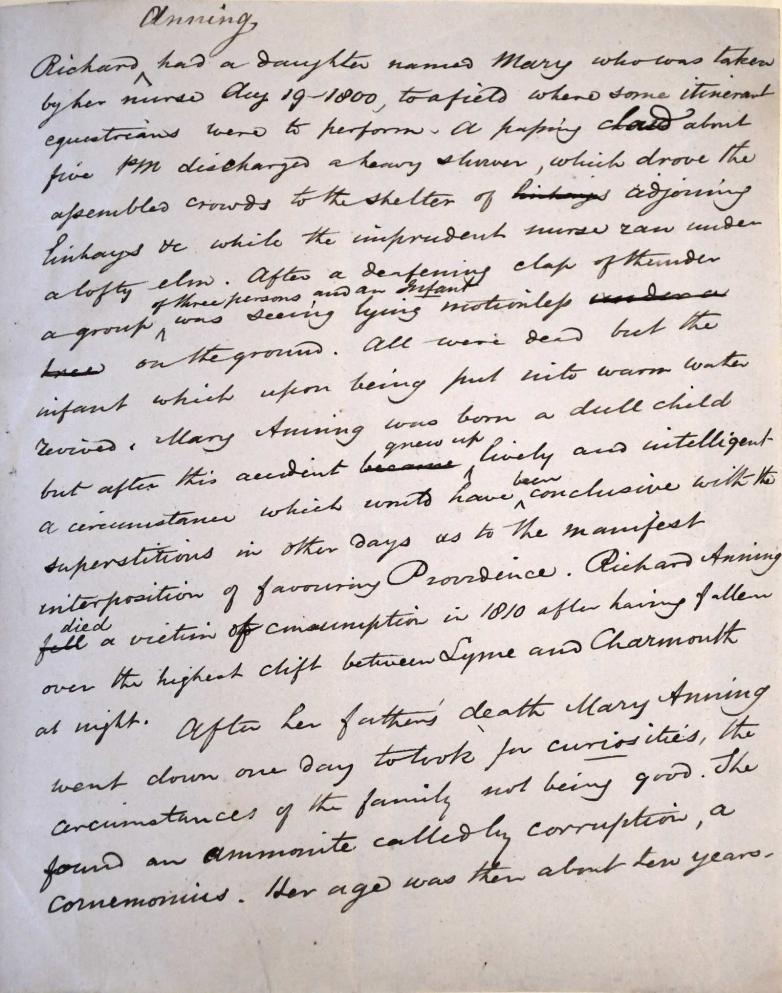 A page from the manuscript which includes details of Mary Anning being struck by lightning as a baby.