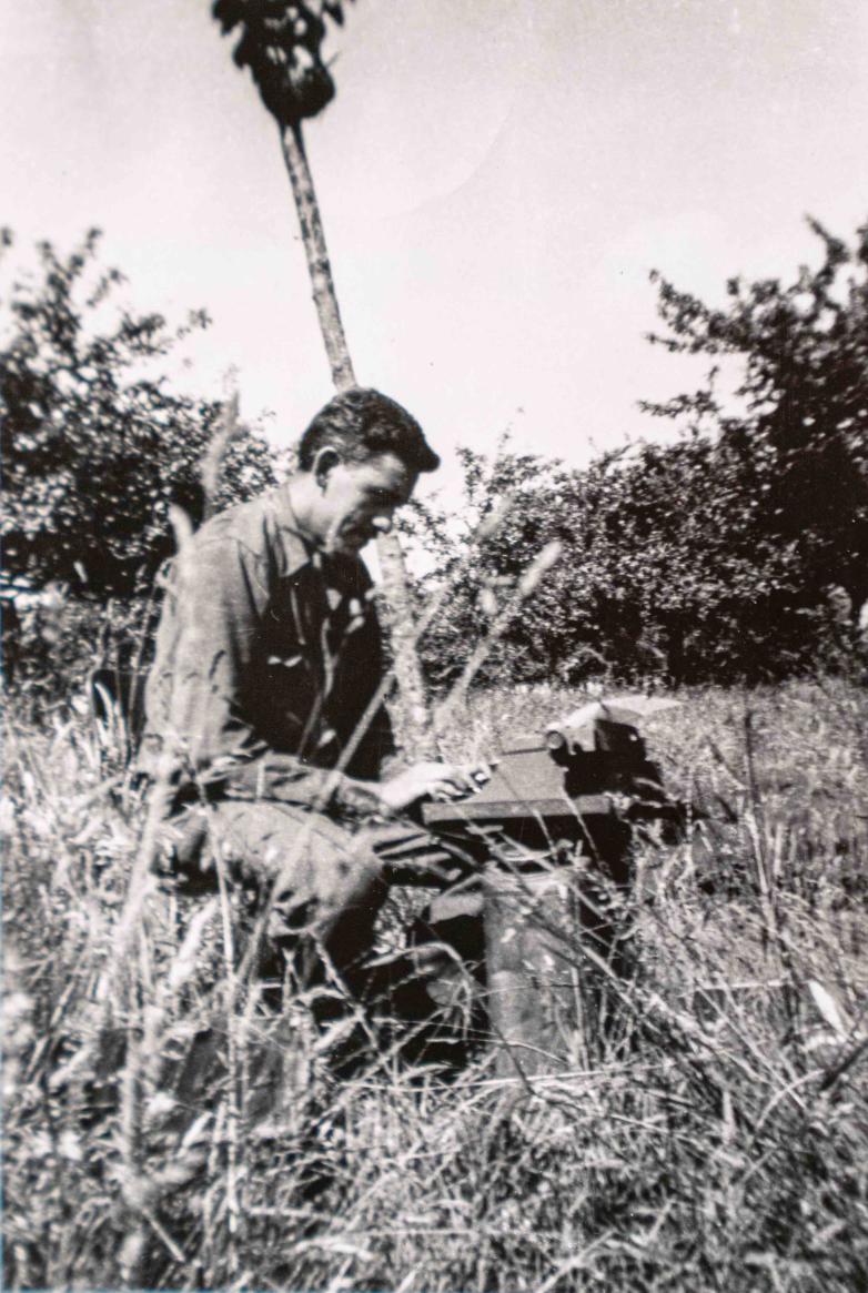 J. D. Salinger with typewriter in Normandy, France, 1944.