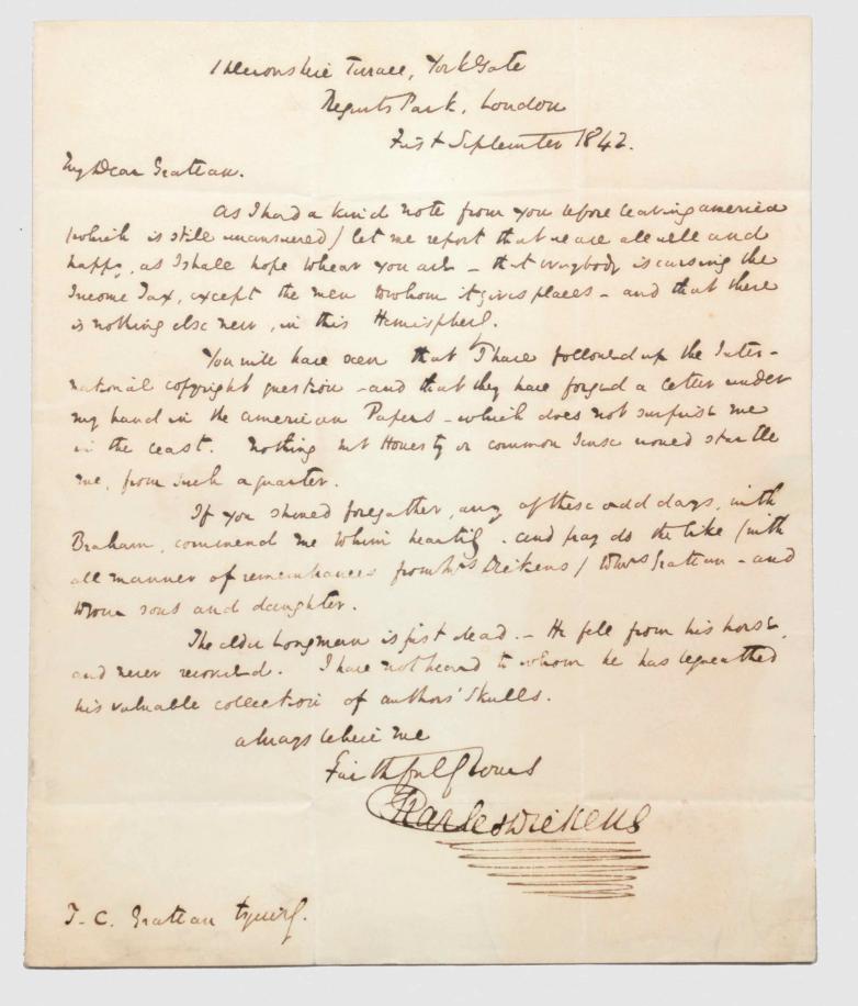 greatest blight to his trip – Dickens’s critical views on the lack of an international copyright agreement met with widespread condemnation in the American press, and even led to a forged letter attributed to Dickens being published in the New York Tatler, which particularly irritated Dickens. The fascinating letter is, however, very friendly and ends with a comment that he came back to the UK to find that the only change in Britain was an increase in income tax.