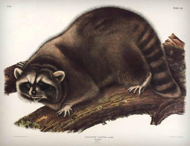 Audubon's Raccoon, hand-colored lithograph from his Viviparous Quadrupeds of North America. Offered at Trillium Antique Prints & Rare Books sale on Saturday (estimate $6,000–12,000).