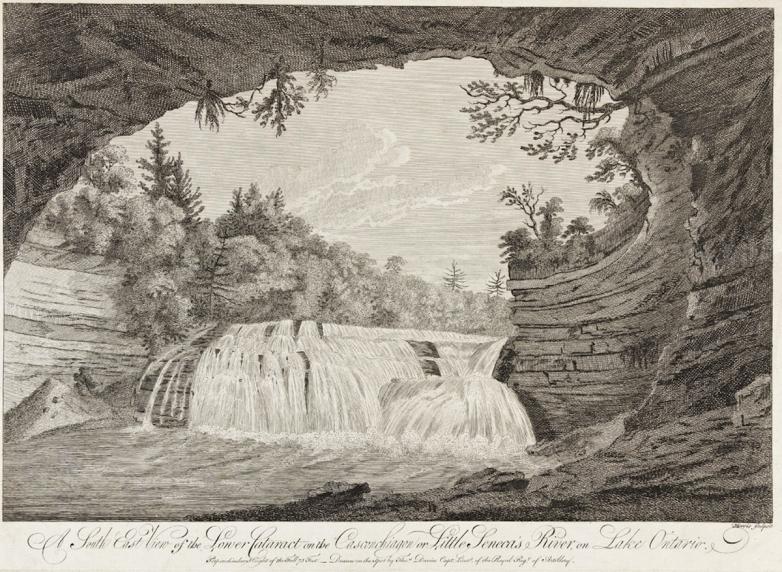 Engraving after Thomas Davies of an American waterfall (1768), offered at Swann Galleries this week.