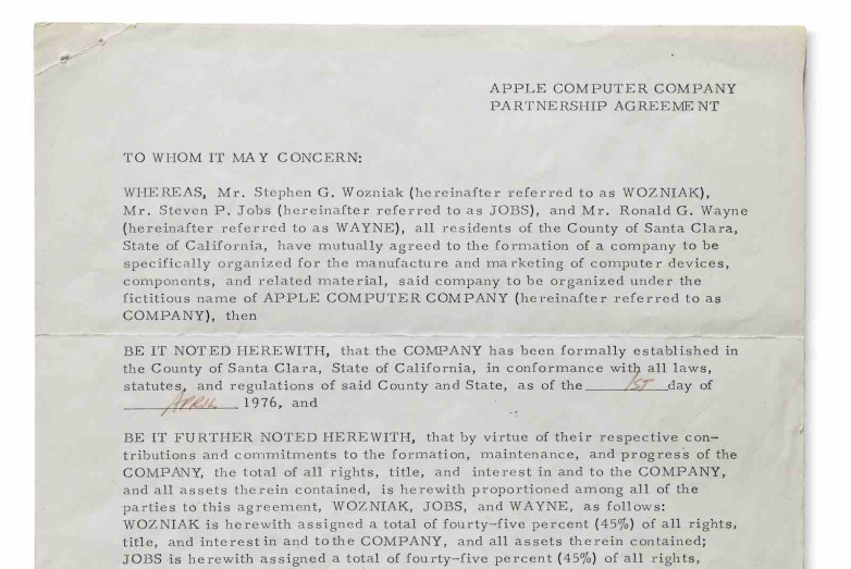 Also going under the hammer will be The Apple Computer Company Partnership Agreement signed by Steve Jobs and Steve Wozniak 50 years ago, on April 1, 1976 (estimate: $2m–$4m). It marks the very beginning of the company - at the time they signed this contract Wozniak was 25, and Jobs 21.