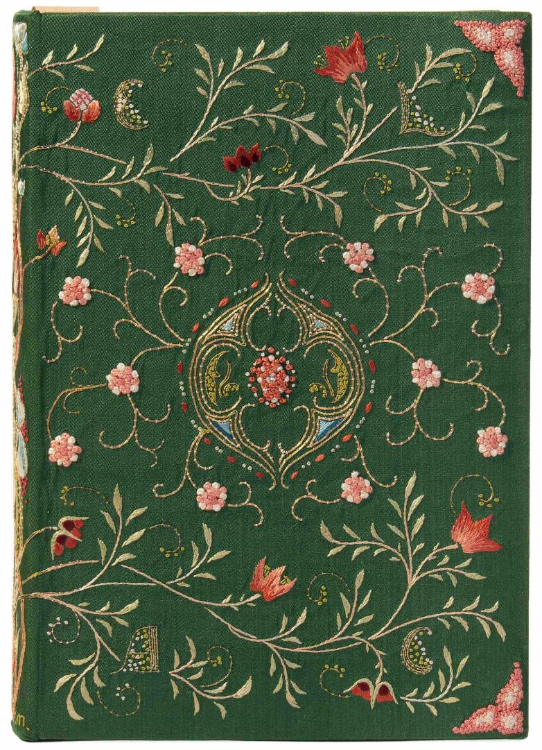 * May Morris, daughter of William Morris and director of embroidery at Morris & Co., created the ca. 1888 floral embroidered binding for the publication Embroidery and Lace: Their Manufacture and History from the Remotest Antiquity to the Present Day by Ernest Lefébure. Featuring bright green ribbed silk and pink flowers, with a central arabesque on the cover, Morris signed the spine “.m.” at the bottom right corner.