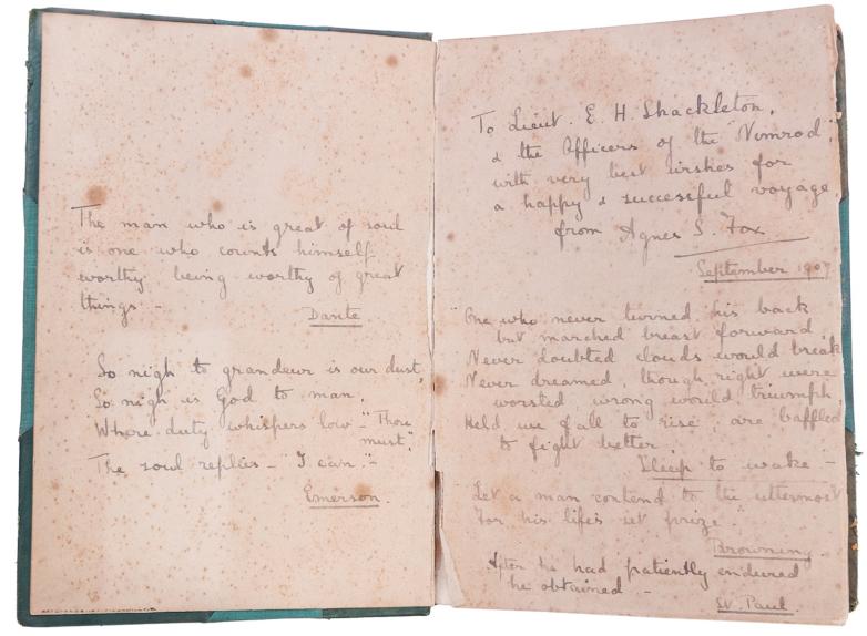• Lot #43, a real photograph postcard signed by Shackleton, was estimated at $1,500-2,500 and realized an astonishing $16,800. This unused, glossy postcard depicted a three–quarter view portrait of the explorer in formal attire and was signed “E.H. Shackleton.” This image was taken in London by John Thomson and John Newlands in 1908.