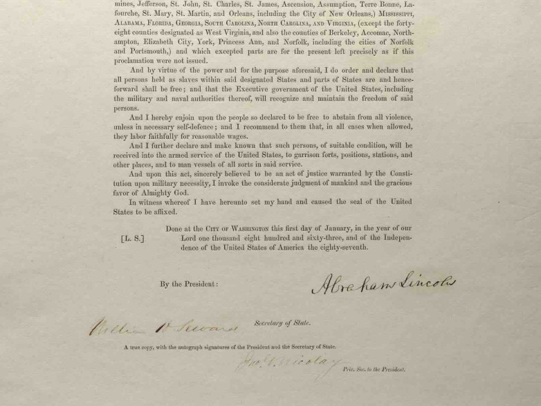 • one of only 27 known copies of a version of the Emancipation Proclamation signed by President Abraham Lincoln, Secretary of State William Seward, and Lincoln’s secretary John Nicholay (estimate: $3m–$5m)