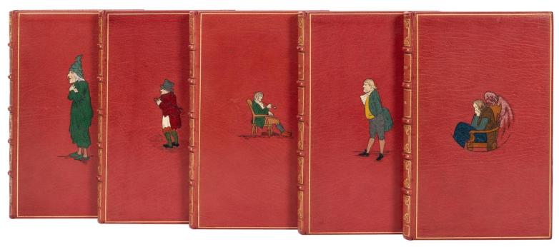 • Lot #395, a collection of five Christmas books by Dickens, was estimated at $6,000-8,000 and traded hands at $28,000 - another world's record! All were first editions and published in London in the 1843–1848 timeframe. Titles included A Christmas Carol, The Chimes, The Battle of Life, and The Haunted Man. Each volume was finely bound , with their upper covers featuring various color morocco inlays depicting a Dickens character from its corresponding work.