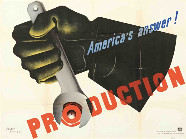 French artist Jean Carlu created a series of posters for the United States Government to promote production of war materials during World War II. The posters aimed to boost the morale of factory workers.