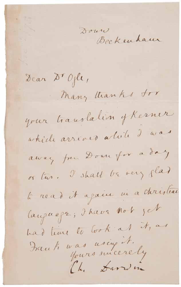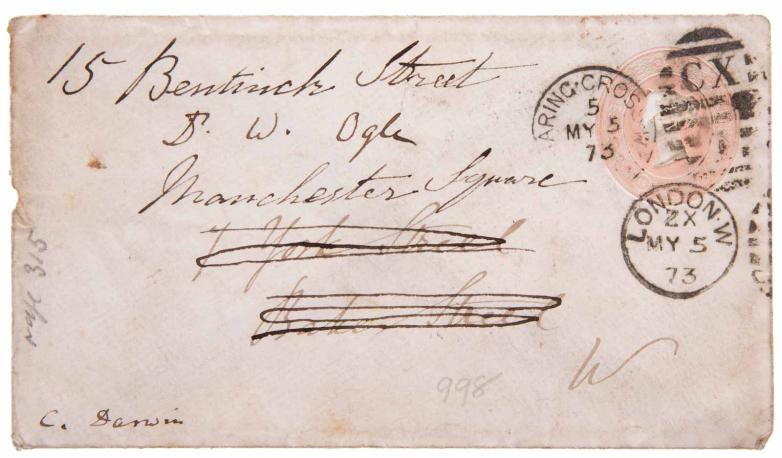 “On the Origin of Species” was written by Darwin in 1858 as a result of his five-year journey around the globe aboard the HMS Beagle. Through his observations, Darwin concluded that evolution occurs through a process of natural selection, which means that both plants and animals adapt to their surroundings over a period of time in order to have a better chance of surviving and reproducing. “On the Origin of Species” was later edited by John Murray in 1859, and 1250 copies were published later that same year. This first edition is also accompanied by a letter addressed to William Ogle, written by Emma Darwin and signed by Charles Darwin, as well as an envelope also signed by him.