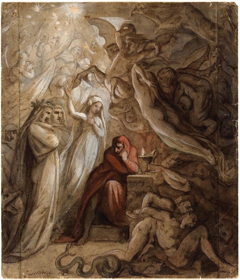 All twenty-two works on view through July 16 in Going through Hell: The Divine Dante are from the National Gallery’s own collection. We are fortunate to hold many objects, primarily from the Prints and Drawings collection, which relate to the writer and his work. Our library’s Rare Book Collection includes early printed and beautifully illustrated editions of the Commedia. Auguste Rodin’s The Thinker had its origin in Dante’s Hell, as imagined for Rodin’s door of The Gates of Hell. Never installed in the sculptor’s lifetime, this single bronze figure went on to be recognized as one of the greatest sculptures in European art. Works from well-known artists such as William Blake and Robert Rauschenberg are installed near evocative images by artists that are known to only a few, like Bartolomeo Pinelli, William Etty, or Béla Szabó, all inspired by Dante. It shouldn’t be a surprise that many artists responded to and illustrated scenes from the Inferno, or Hell. While the hope of purgatory and the pleasures of paradise are always appealing, seeing the punishments of Hell is the stuff of nightmares from which we cannot look away! Dante’s genius continues to reach out, and his writing remains relevant to our tumultuous time.