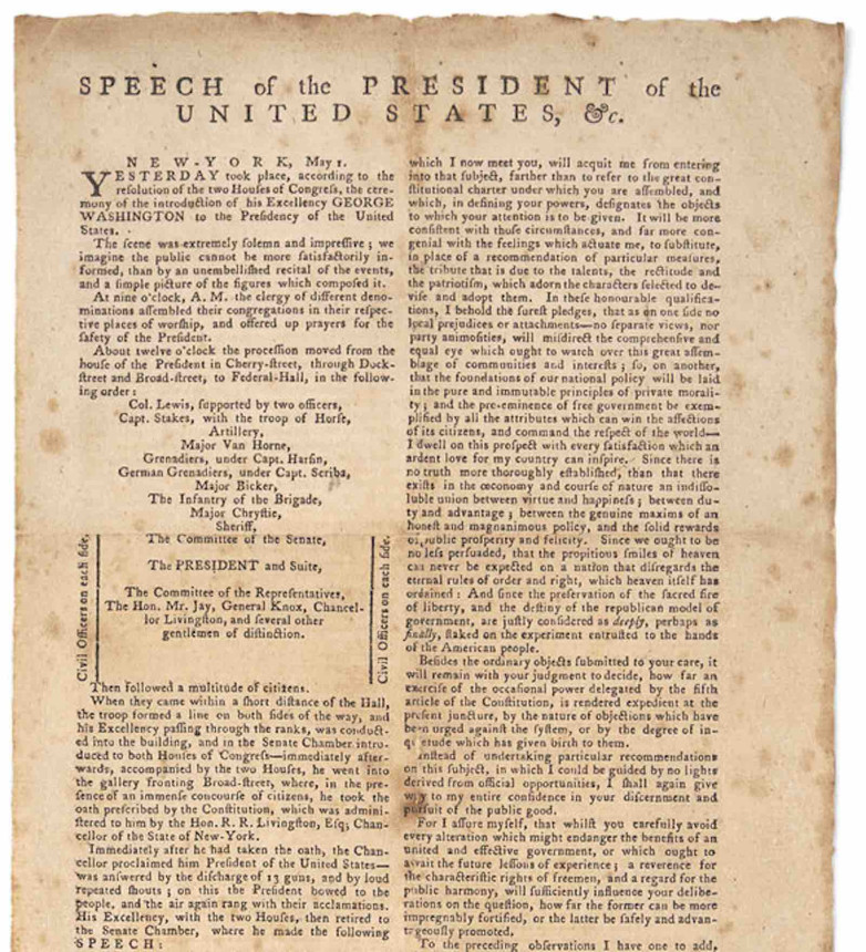 Detail from Printed Broadside of George Washington's inaugural speech sold for $381,500
